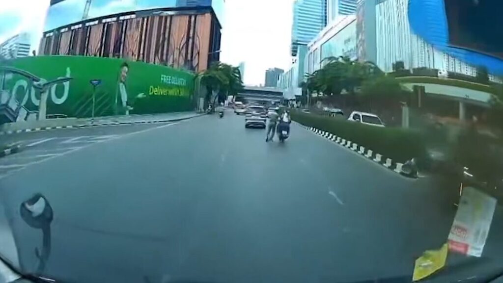 กล้องหน้ารถยนต์คันหนึ่ง จับภาพเหตุการณ์ ตำรวจ สน.ปทุมวัน กำลังวิ่งไล่ตามไรเดอร์ ที่มีผู้โดยสารหญิงซ้อนท้ายรถจักรยานยนต์มาด้วย ขณะที่ตำรวจคว้าแขนไรเดอร์ไว้ ทำให้รถเสียหลักล้ม จนผู้โดยสารหญิงตกจากรถไม่ทันตั้งตัว ศีรษะกระแทกพื้นอย่างแรง บริเวณหน้าห้างสรรพสินค้าแห่งหนึ่ง