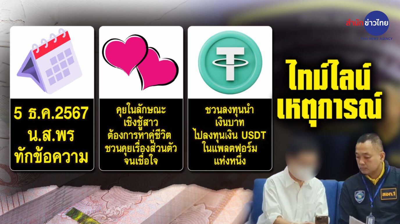นางสาวอ้อ อายุ 65 ปี อดีตพยาบาลผู้เสียหาย เล่าว่า เมื่อวันที่ 5 ธันวาคม 2567 มิจฉาชีพหรือ นางสาวพร (นามสมมติ) ทักข้อความมาหาตนผ่านแอพ TikTok และชวนพูดคุยในลักษณะเชิงชู้สาว และต้องการหาคู่ชีวิต และชวนคุยเรื่องส่วนตัวจนเตนเชื่อใจ จนผ่านไป 2 สัปดาห์ นางสาวพรได้ชวนตนลงทุน โดยอ้างว่าลงทุนร่วมกับป้าที่ทำงานในประเทศสิงคโปร์ ซึ่งป้าเป็นผู้เชี่ยวชาญด้านการลงทุน โดยการให้นําเงินบาทไทยไปซื้อสกุลเงินดิจิทัล ในแพลตฟอร์มชื่อดัง จึงหลงเชื่อและได้โอนเงินไปให้ครั้งแรกเมื่อวันที่ 10 มกราคม 68 ที่ผ่านมา 5,000 บาท จากนั้นผ่านไป 3 อาทิตย์ นางสาวพรได้ลองให้ตนถอนเงินออกมาเพื่อดูว่าได้กำไรเท่าไหร่ ซึ่งตนได้กำไรกลับมา 6,200 บาท