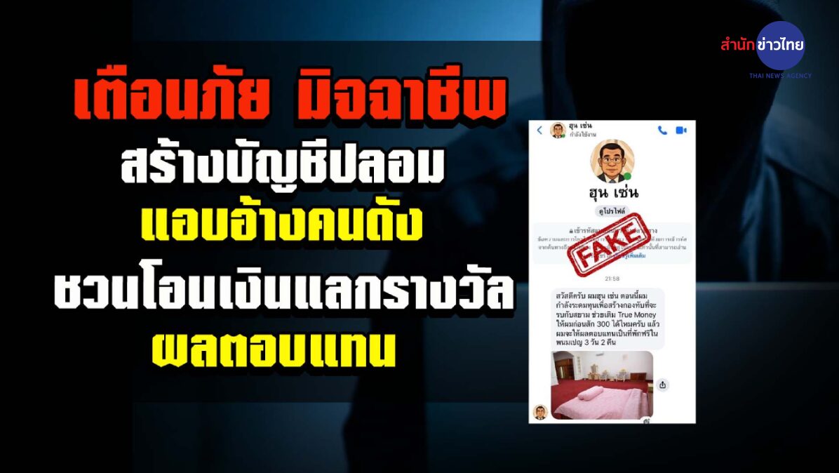 ตำรวจไซเบอร์ ออกมาเตือนภัยประชาชน เนื่องจากขณะนี้ได้มีมิจฉาชีพกลับมาระบาด สร้างบัญชีปลอมแอบอ้างเป็นคนดัง เช่น ผู้นำประเทศ อินฟลูเอนเซอร์ ดารา เป็นต้น แล้วสุ่มติดต่อเข้ามาผ่านแชท พร้อมข้อความชวนให้โอนเงินผ่าน ในช่องทางต่างๆ เพื่อแลกกับรางวัล หรือผลตอบแทนในรูปแบบต่างๆ
