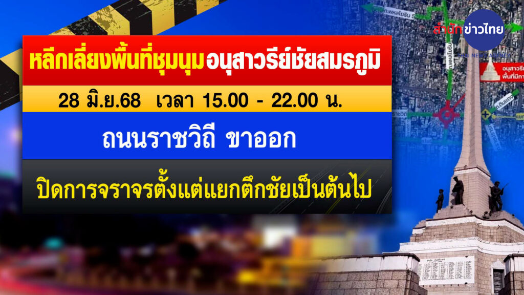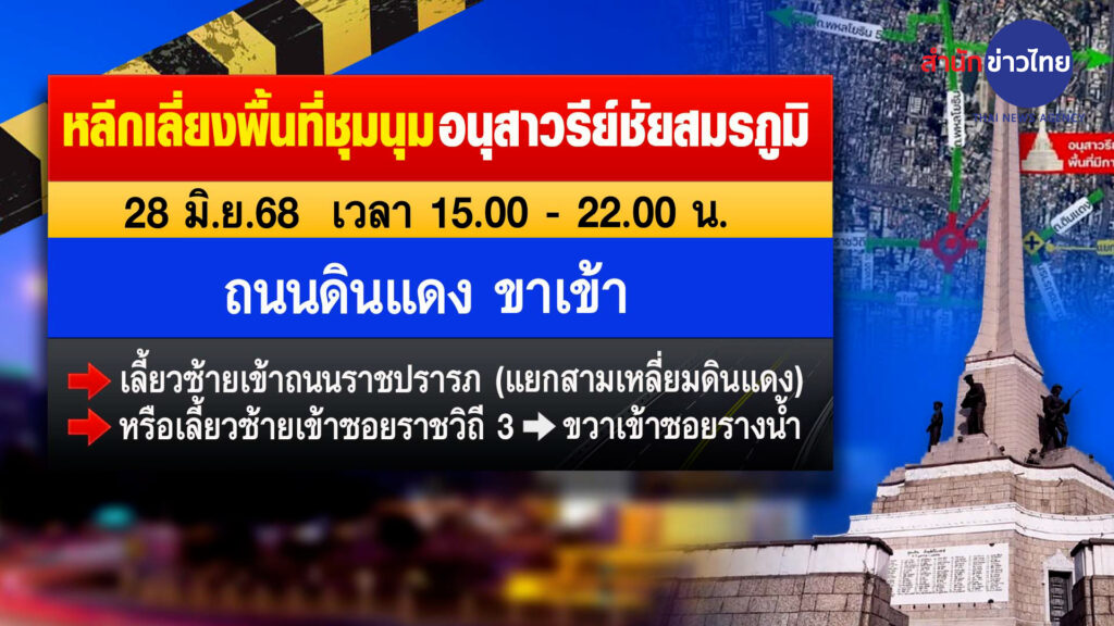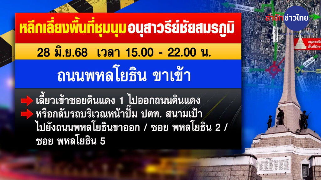 28 มิ.ย.-บช.น.แนะหลีกเลี่ยงเส้นทางโดยรอบอนุสาวรีย์ชัยสมรภูมิ เนื่องจากมีการชุมนุมใหญ่ถึงเวลา 21.00 น. ล่าสุดการจราจรเริ่มติดขัด