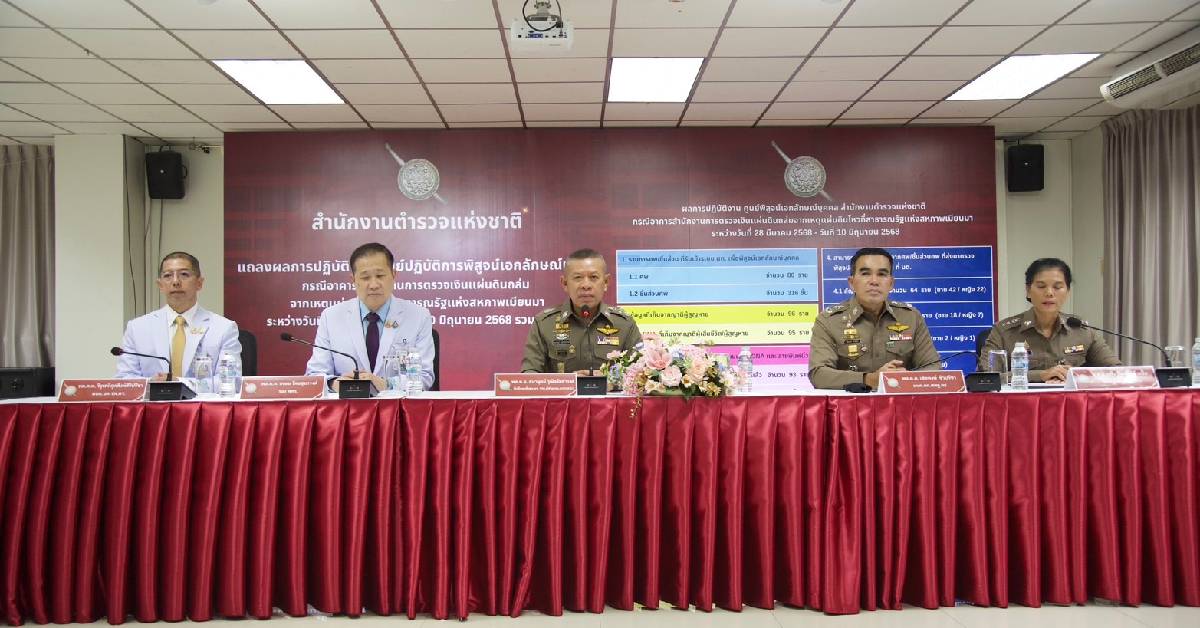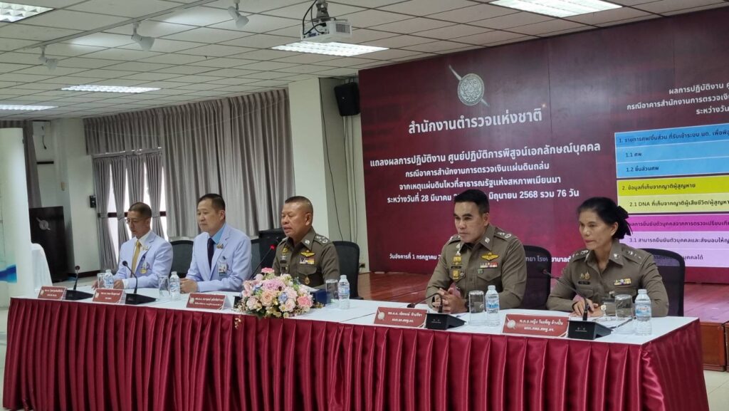 กรุงเทพฯ 1 ก.ค. – พล.ต.อ.ธนายุตม์ วุฒิจรัสธํารงค์ รักษาราชการแทนผู้ช่วย ผบ.ตร. และในฐานะ ผอ.ศูนย์ปฏิบัติการพิสูจน์เอกลักษณ์บุคคล สํานักงานตํารวจแห่งชาติ พร้อมด้วย พล.ต.ต.วิรุฬห์ ศุภสิงห์ศิริปรีชา ผู้บังคับการสถาบันนิติเวชวิทยา โรงพยาบาลตำรวจ และเจ้าหน้าที่ที่เกี่ยวข้องร่วมกันแถลงผลการพิสูจน์เอกลักษณ์บุคคล จากกรณีเหตุอาคารสํานักงานการตรวจเงินแผ่นดิน หรือ ตึก สตง.พังถล่ม จากเหตุแผ่นดินไหวเมื่อวันที่ 28 มีนาคม 2568