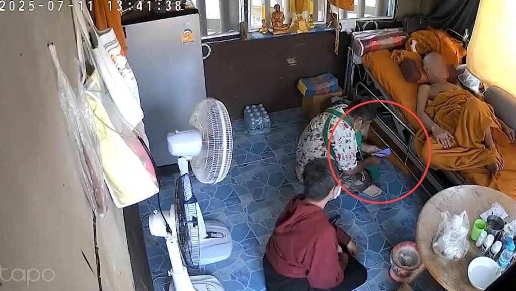 กล้องวงจรปิดบันทึกภาพขณะ ผู้หญิง 2 คนเข้าไปในกุฏิที่พระสงฆ์นอนอาพาธอยู่ คนหนึ่งนั่งพื้นส่วนอีกคนยืนอยู่แล้วเอื้อมมือไปหยิบโทรศัพท์มือถือบนเตียงนอนไป