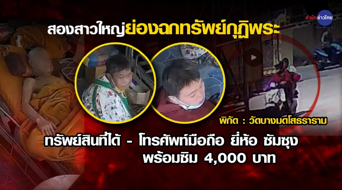 กทม. 12 ก.ค. – สองสาวใหญ่ ย่องเข้ากุฏิพระอาพาธ ฉกโทรศัพท์มือถือลอยนวล พบเคยเข้ามาขอเงินหลวงตาแล้วครั้งหนึ่ง