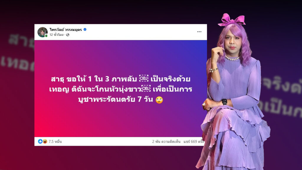 ส่วนแพรรี่ ไพรวัลย์ วรรณบุตร โพสต์ข้อความผ่าน FB ส่วนตัว “สาธุ ขอให้ 1 ใน 3 ภาพลับ เป็นจริงด้วยเทอญ ดิฉันจะโกนหัวนุ่งขาว เพื่อเป็นการบูชาพระรัตนตรัย 7 วัน”