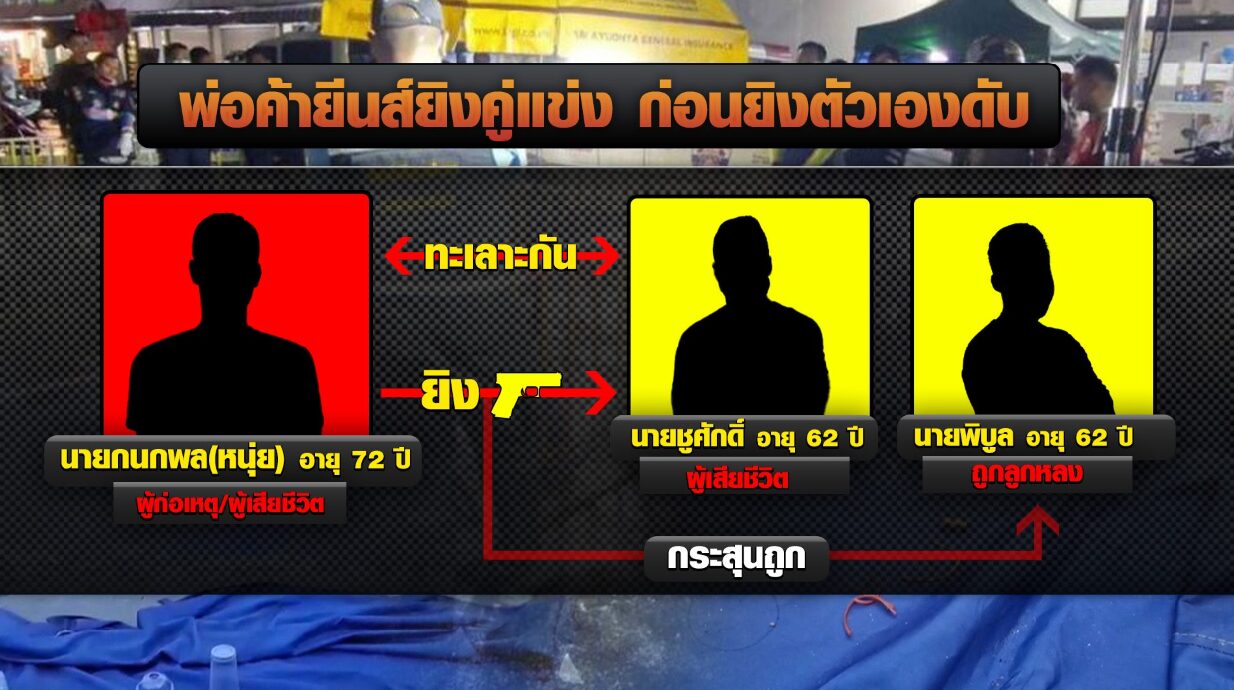ด้านนางน้อย อายุ 65 ปี ภรรยาผู้เสียชีวิต กล่าวว่า สาเหตุเกิดจากการทะเลาะวิวาทขายกางเกงแย่งลูกค้ากันมีการกระทบกระทั่งกับนายชูศักดิ์มาหลายครั้ง หลังสามีไปยิงนายชูศักดิ์ กลับมาบอกตนว่า “ไปยิงนายชูศักดิ์ตาย” ตนต่อว่าบอกไปว่า “ไปยิงคนตายจะติดคุก” แต่สามีบอกว่า “ไม่ติดคุกหรอก” ก่อนใช้ปืนยิงตัวตายหนีความผิด.-สำนักข่าวไทย