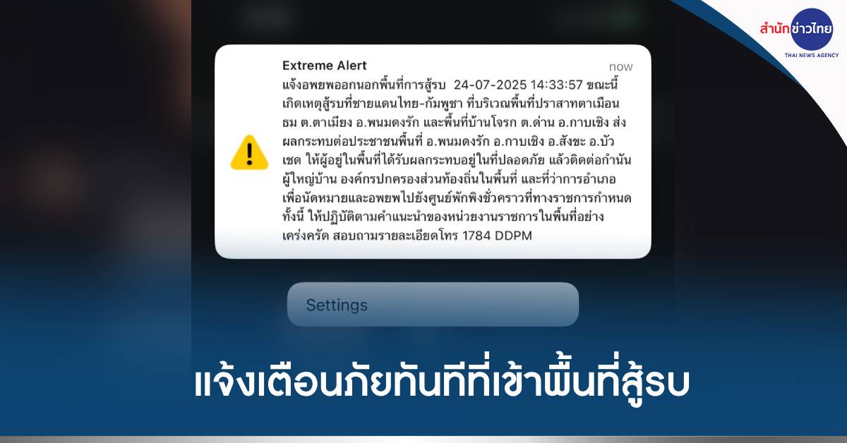 กทม. 24 ก.ค.-Cell Broadcast ปภ. แจ้งเตือนภัยทันทีที่เข้าพื้นที่สู้รบ ขอความร่วมมืออพยพเข้าพื้นที่ปลอดภัย จากพื้นที่สู้รบ พร้อมให้ประสานผู้นำชุมชนอพยพเข้าศูนย์พักพิง