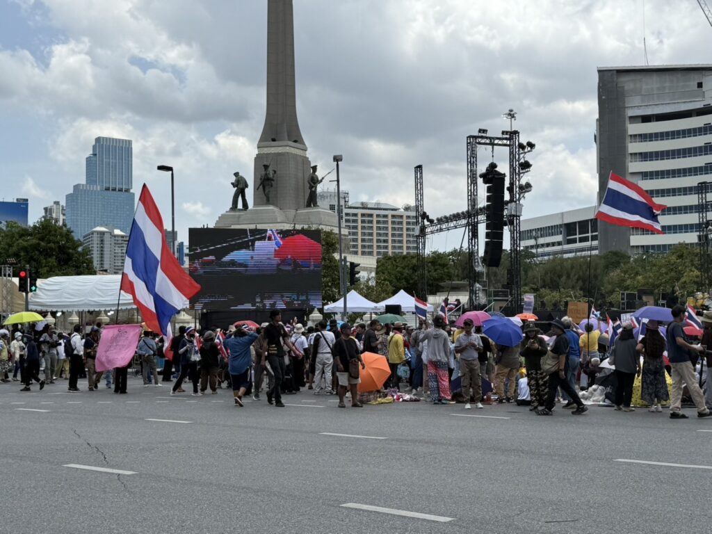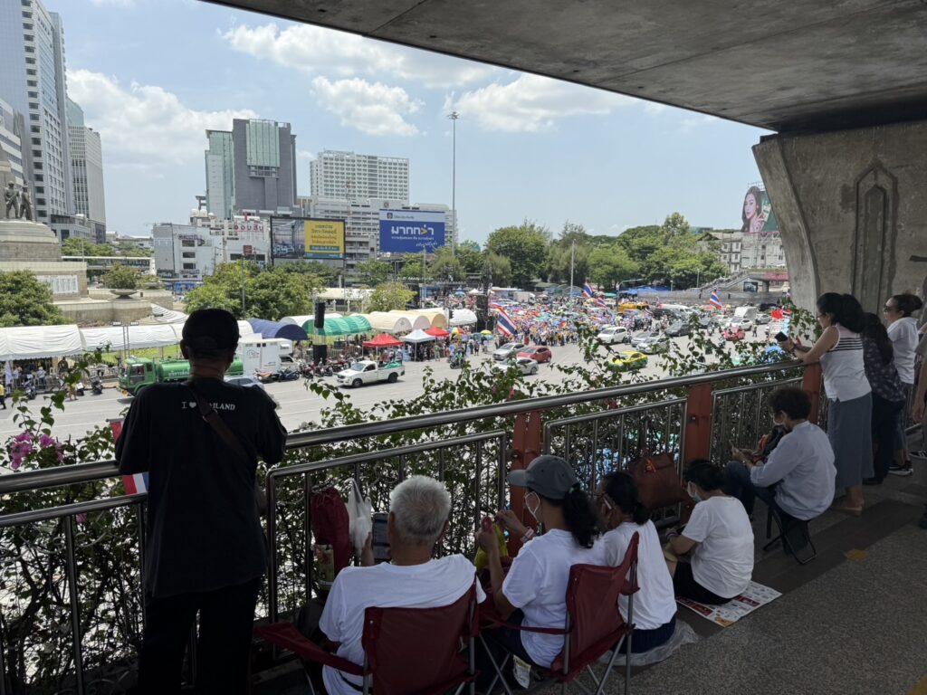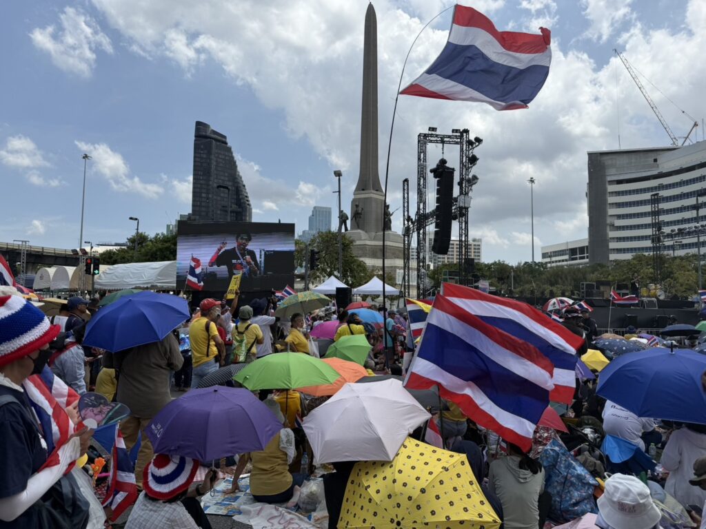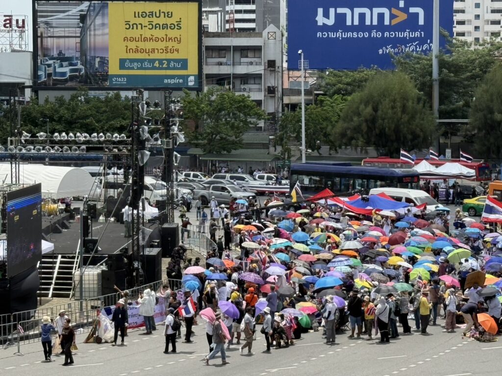 กทม. 2 ส.ค. – ผู้ชุมนุมกลุ่มรวมพลังแผ่นดินฯ ปักหลักฟังปราศรัย ทั้งปมชายแดนไทย-กัมพูชา ย้ำให้กำใจทหารแนวหน้า ขณะตำรวจตั้งจุดคัดกรองก่อนเข้าพื้นที่ชุมนุม