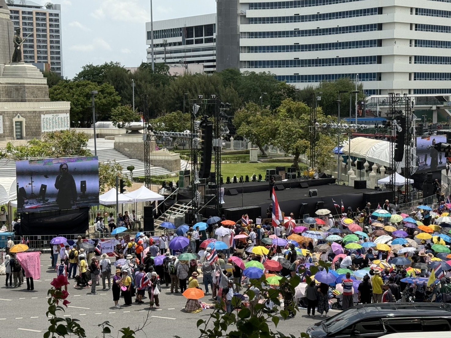 14.00 น. บรรยากาศการชุมนุมของกลุ่มรวมพลังแผ่นดินปกป้องอธิปไตย นัดหมาย “ส่งกำลังใจ รวมพลังแผ่นดิน จากแนวหลังสู่แนวหน้า” ที่อนุสาวรีย์ชัยสมรภูมิ ผู้ชุมนุมยังคงปักหลักฟังการปราศรัย และมีบางส่วนที่เพิ่งทยอยมาถึง และจากสภาพอากาศร้อนจัด ทำให้บางส่วนขึ้นไปกระจุกตัวนั่งร่วมชุมนุมอยู่บนสกายวอล์ก ทำให้พื้นที่ถนนด้านล่าง ตำรวจยังคงจัดการจราจรได้ตามปกติ และในบางช่วงจะใช้วิธีการสลับรถแบ่งกันวิ่งเพื่อระบายรถ หากโซนไหนมีรถติดค้างอยู่จำนวนมาก แต่ยังแนะนำหากไม่จำเป็นให้หลีกเลี่ยงเส้นทางที่เกี่ยวข้อง เพราะการจราจรโดยรอบติดขัด