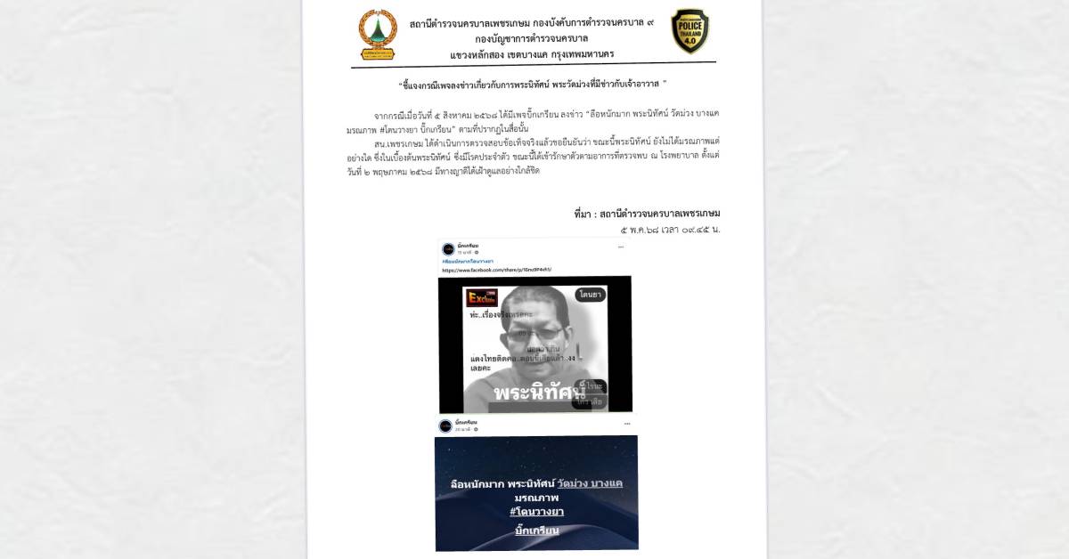กรุงเทพฯ 5 ส.ค. – สน.เพชรเกษม ยันพระนิทัศน์ยังไม่ได้มรณภาพ เพียงแค่เข้ารักษาตามอาการโรคประจำตัว