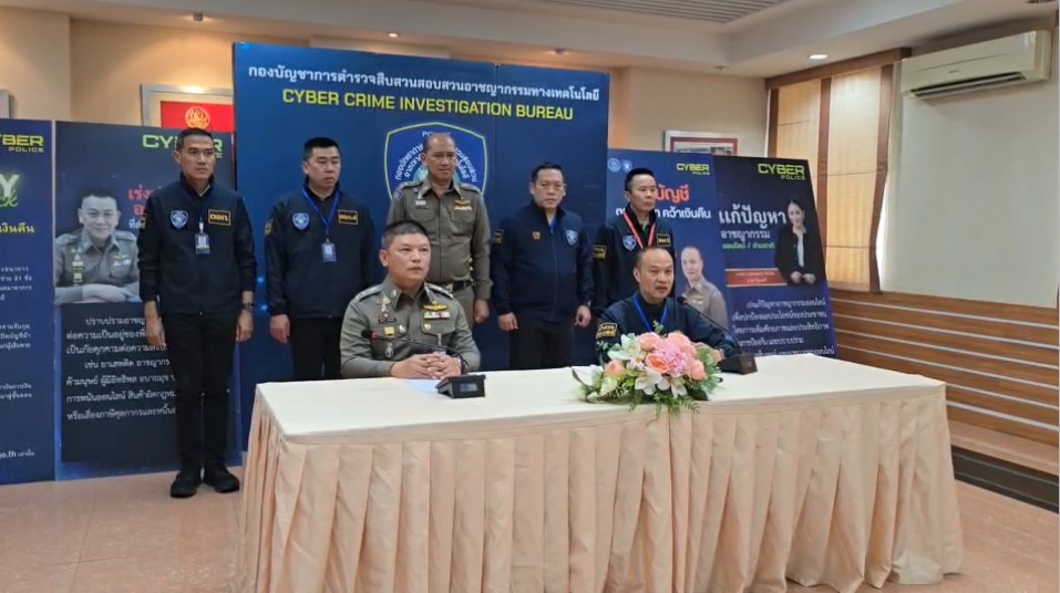 พล.ต.ท.ไตรรงค์ ผิวพรรณ ผบช.สอท. พร้อมเจ้าหน้าที่ที่เกี่ยวข้องร่วมแถลงข่าว “MONEY CASH BACK ปิดบัญชี ตามล่าม้า คว้าเงินคืน EP.26” ตำรวจไซเบอร์รวบเครือข่ายอ้างเป็นหลานเพื่อนสนิท ตีซี้ชวนลงทุน หลอกโอนรัวๆ กว่า 12 ล้าน อายัดทันเกือบ 5 แสน นำคืนผู้เสียหาย