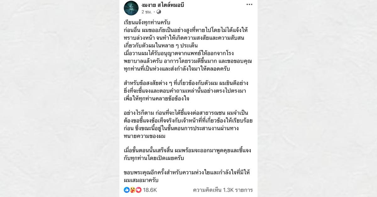 สำหรับข้อสงสัยต่าง ๆ ที่เกี่ยวข้องกับตัวผม ผมยินดีอย่างยิ่งที่จะชี้แจงและตอบคำถามเหล่านั้นอย่างตรงไปตรงมา เพื่อให้ทุกท่านคลายข้อข้องใจ อย่างไรก็ตาม ก่อนที่จะได้ชี้แจงต่อสาธารณชน ผมจำเป็นต้องขอชี้แจงข้อเท็จจริงกับเจ้าหน้าที่ที่เกี่ยวข้องให้เรียบร้อยก่อน ซึ่งขณะนี้อยู่ในขั้นตอนการประสานงานผ่านทางทนายความของผม เมื่อขั้นตอนนั้นเสร็จสิ้น ผมพร้อมจะออกมาพูดคุยและชี้แจงกับทุกท่านโดยเปิดเผยครับ ขอบพระคุณอีกครั้งสำหรับความห่วงใยและกำลังใจที่มีให้ผมเสมอมาครับ”