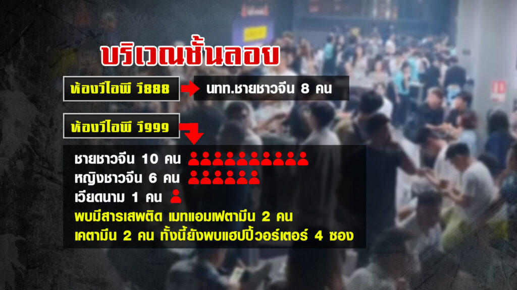 บริเวณชั้นลอยซึ่งแบ่งเป็นห้องวีไอพี จำนวน 4 ห้อง ห้องวีไอพี วี888 พบนักท่องเที่ยวชายชาวจีน 8 คน ห้องวีไอพี วี 999 พบนักท่องเที่ยว 17 คน แบ่งชายชาวจีน 10 คน หญิงชาวจีน 6 คน เวียดนาม 1 คน พบมีสารเสพติด เมทแอมเฟตามีน 2 คน เคตามีน 2 คน ทั้งนี้ยังพบแฮปปี้วอร์เตอร์ จำนวน 4 ซอง ตกอยู่ใกล้ตู้เก็บแก้วในห้อง เมื่อสอบถามนักท่องเที่ยวภายในห้องกลับไม่มีใครรับเป็นเจ้าของ เจ้าหน้าที่จึงประสานกองพิสูจน์หลักฐานเข้ามาเก็บดีเอ็นเอ นักเที่ยวที่อยู่ภายในห้องเพื่อหาเจ้าของ