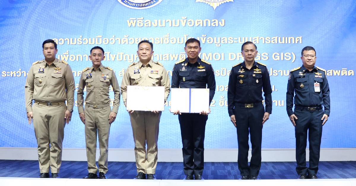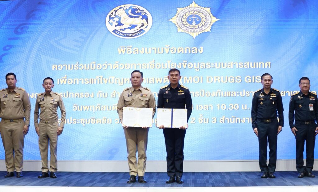ป.ป.ส. 21 ส.ค. -พล.ต.ท.ภาณุรัตน์ หลักบุญ เลขาธิการคณะกรรมการป้องกันและปราบปรามยาเสพติด (เลขาธิการ ป.ป.ส.) และ นายนิรัตน์ พงษ์สิทธิภาวร อธิบดีกรมการปกครอง ร่วมลงนามบันทึกข้อตกลงความร่วมมือว่าด้วยการเชื่อมโยงข้อมูลระบบสารสนเทศกลางเพื่อการแก้ปัญหายาเสพติด (MOI DRUGS GIS) ระหว่างกรมการปกครอง กับ สำนักงานคณะกรรมการป้องกันและปราบปรามยาเสพติด เชื่อมโยงแลกเปลี่ยนข้อมูลสารสนเทศเพื่อใช้ประโยชน์จากผลการสำรวจข้อมูล บุคคลที่เกี่ยวข้องกับยาเสพติดที่อยู่ในความควบคุมดูแลของศูนย์สารสนเทศเพื่อการบริหารงานปกครองกรมการปกครอง มีวัตถุประสงค์ คือ 1. เพื่อพัฒนาและแลกเปลี่ยนข้อมูลผลการสำรวจบุคคลที่เกี่ยวข้องกับยาเสพติดระดับหมู่บ้าน/ชุมชนในพื้นที่ความรับผิดชอบของกรมการปกครอง รวมทั้งข้อมูลอื่น ๆ ที่เกี่ยวข้องในรูปแบบอิเล็กทรอนิกส์ 2. เพื่อการตรวจสอบผลการดำเนินงานต่อบุคคลในการป้องกัน ปราบปราม และแก้ไขปัญหายาเสพติดเป็นไปโดยสะดวก รวดเร็ว และมีประสิทธิภาพยิ่งขึ้น เป็นประโยชน์ต่อการปฏิบัติงานที่เกี่ยวข้องภายใต้ขอบเขตอำนาจหน้าที่ตามกฎหมายและระเบียบของทั้งสองฝ่าย