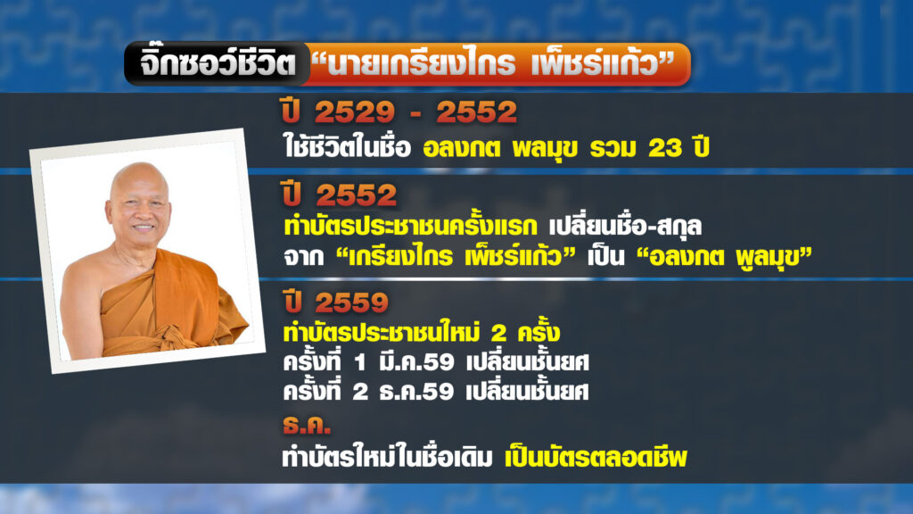 ปี 2552 พบว่าทำบัตรประชาชนครั้งแรก เปลี่ยนชื่อ-นามสกุล จากนายเกรียงไกร เพ็ชร์แก้ว เป็นอลงกต พูลมุข ปี 2559 ทำบัตรประชาชน 2 ครั้ง ครั้งแรกเดือนมีนาคม เปลี่ยนชั้นยศพระจากพระราชวิสุทธิประชานาถ เป็นพระอุดมประชาทร อีกครั้งเดือนธันวาคม ทำบัตรใหม่ เปลี่ยนจากพระอุดมประชาทร กลับไปเป็นพระราชวิสุทธิประชานาถ