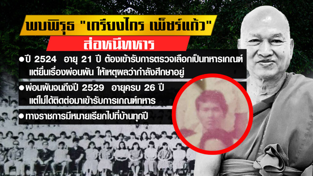 มีรายงานว่าหลังจากอายุ 26 ปี ทางราชการมีหมายเรียกไปที่บ้านทุกปี แต่นายเกรียงไกร ไม่ได้รับหมายเรียก การไม่ได้รับหมายเรียกทำให้อายุความน้อยกว่าการได้รับหมายเรียก คือโดยมีอายุความ 5 ปี แต่ถ้ารับหมายเรียกแล้วไม่มารับการตรวจเลือกเป็นทหารเกณฑ์ อายุความ 10 ปี ทำให้ถูกมองว่า ตลอด 6 ปีที่หายไป และกลับมาอีกครั้งในฐานะผู้ทรงศีล ในชื่อ “อลงกต พลมุข” ไม่ใช่ชื่อที่แท้จริงว่า “เกรียงไกร เพ็ชร์แก้ว” เป็นเพราะเรื่องนี้หรือไม่ คนที่ตอบเรื่องนี้ได้ก็คือ “หลวงพ่ออลงกต” เท่านั้น.-สำนักข่าวไทย