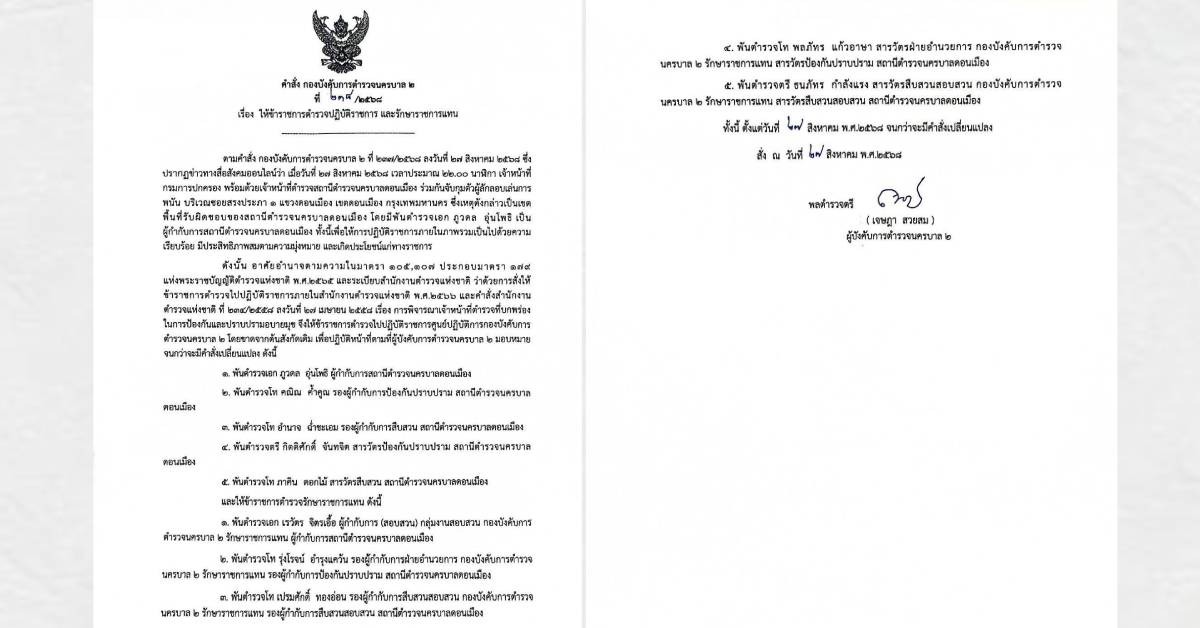 ดังนั้น อาศัยอำนาจตามความในมาตรา 105, 107 ประกอบมาตรา 179 แห่งพระราชบัญญัติตำรวจแห่งชาติ พ.ศ.2565 และระเบียบสำนักงานตำรวจแห่งชาติว่าด้วยการสั่งให้ ข้าราชการตำรวจไปปฏิบัติราชการภายในสำนักงานตำรวจแห่งชาติ พ.ศ.2566 และคำสั่งสำนักงาน ตำรวจแห่งชาติ ที่ 234/2558 ลงวันที่ 27 เมษายน 2558 เรื่อง การพิจารณาเจ้าหน้าที่ตำรวจที่บกพร่องในการป้องกันและปราบปรามอบายมุข จึงให้ข้าราชการตำรวจไปปฏิบัติราชการศูนย์ปฏิบัติการกองบังคับการ ตำรวจนครบาล 2 โดยขาดจากต้นสังกัดเดิม เพื่อปฏิบัติหน้าที่ตามที่ผู้บังคับการตำรวจนครบาล 2 มอบหมาย จนกว่าจะมีคำสั่งเปลี่ยนแปลง ดังนี้