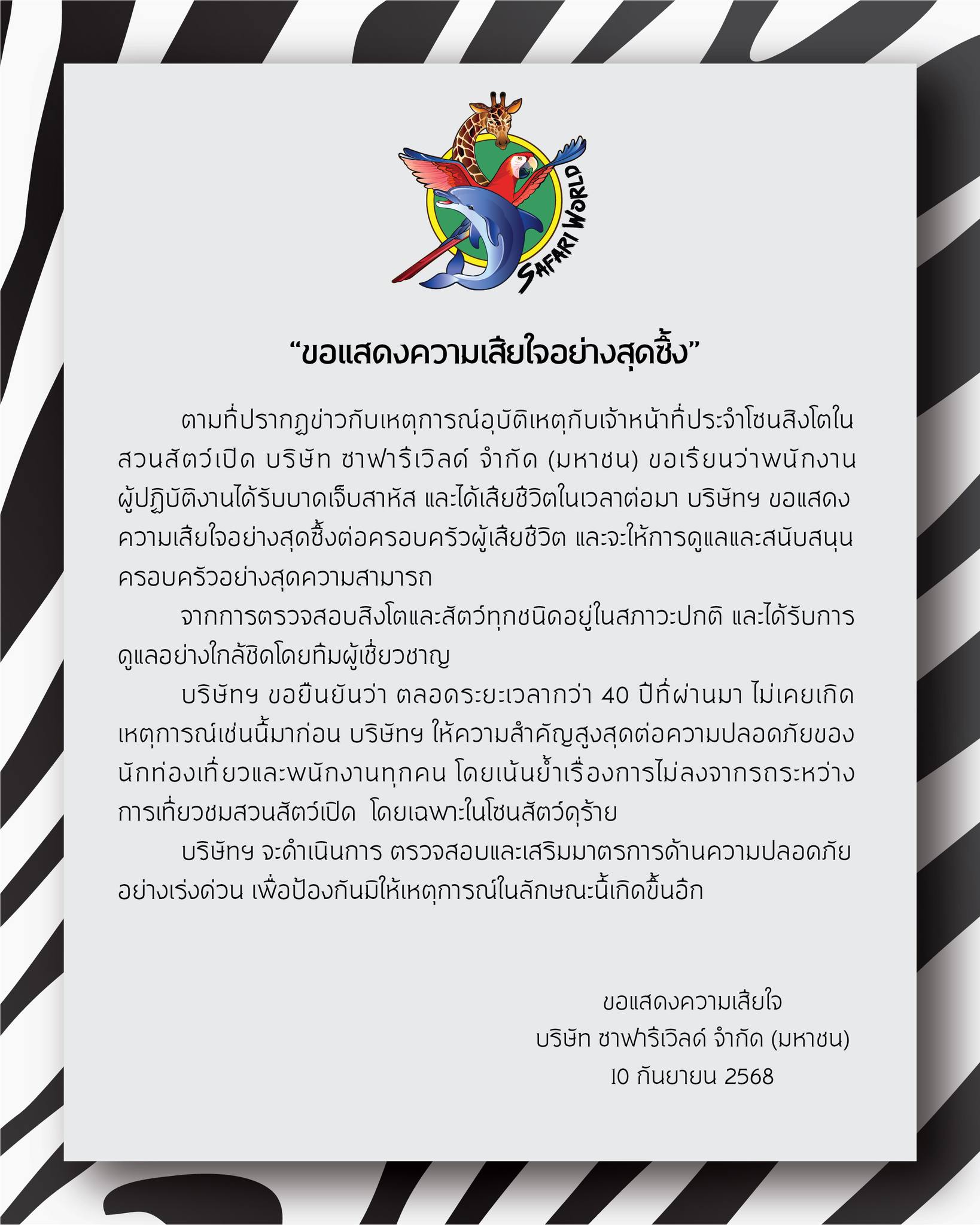 ขณะที่ทางสวนสัตว์ฯ ออกแถลงการณ์แสดงความเสียใจอย่างสุดซึ้งต่อเหตุการณ์ที่เกิดขึ้น พร้อมจะให้การดูแลและสนับสนุนครอบครัวผู้เสียชีวิตอย่างสุดความสามารถ
