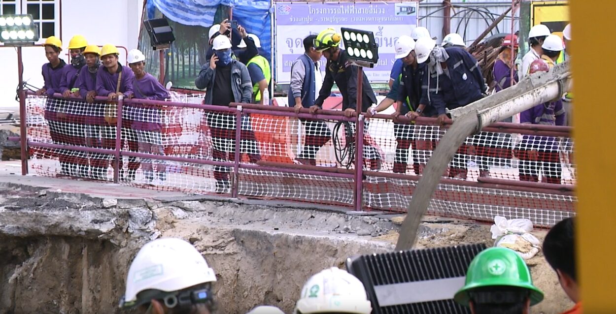 กทม. 25 ก.ย.-เริ่มแล้วปฏิบัติการเทปูนลงในหลุมถนนทรุด เพื่ออุดรอยรั่ว เนื่องจากกังวลว่าฝนจะตก และดินอาจสไลด์เพิ่ม