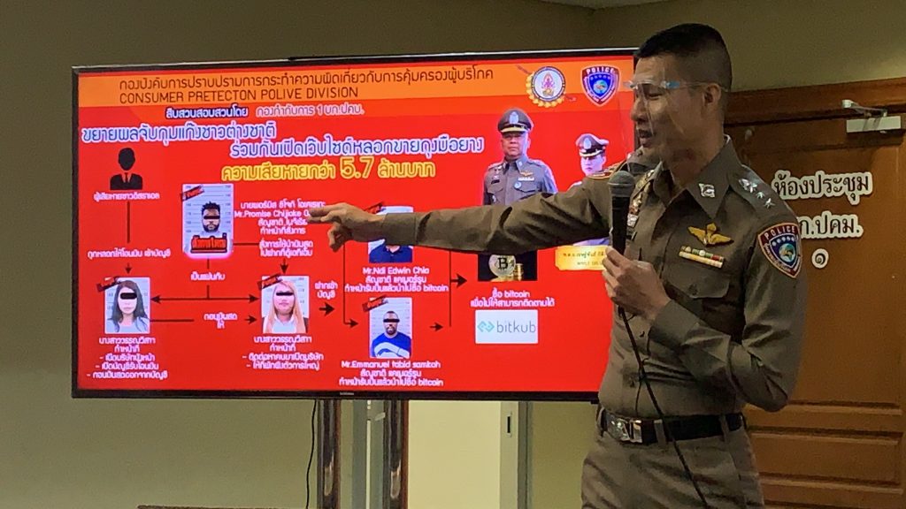 พลตำรวจตรีณัฐศักดิ์ เชาวนาศัย ผู้บังคับการ ปคบ.พร้อมพันตำรวจเอกเชษฐ์พันธ์ กิติเจริญศักดิ์ ผกก.1 ปคบ. แถลงว่า ผู้ต้องหา 3 คนเป็นชาวไทยและชาวต่างชาติ ร่วมกันโฆษณาหลอกขายถุงมือยางผ่านเว็บไซต์ ประกอบด้วย น.ส.ธัญวรส วรสาร อายุ 24 ปี, นายเฟอร์ดินาน อะยัด อัคบอร์ (Mr.Ferdinand Ayuk Agbor) ชาวแคมเมอร์รูน อายุ 34 ปี และนายซูฮาดู ทราโอเร่ (Mr.Souhadou Traore) ชาวโกตดิวัวร์ (ไอเวอรี่โคสต์) อายุ 35 ปี ถูกดำเนินคดีข้อหา “ร่วมกันฉ้อโกงประชาชน,ร่วมกันโดยทุจริตหรือโดยหลอกลวง นําเข้าสู่ระบบคอมพิวเตอร์ซึ่งข้อมูลคอมพิวเตอร์ อันเป็นเท็จ โดยประการที่น่าจะเกิดความเสียหายแก่ประชาชน, ร่วมกันฟอกเงิน และสมคบกันฟอกเงิน” โดยยึดทรัพย์สินที่เป็นของกลาง รวมมูลค่ากว่า 2 ล้านบาท