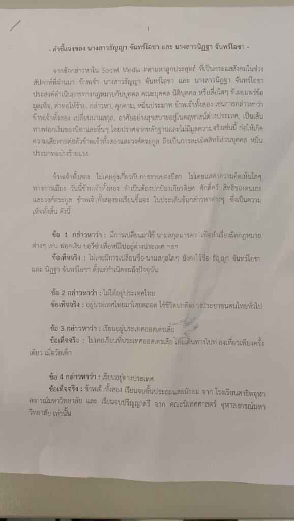 ที่ สน.นางเลิ้ง นายอภิวัฒน์ ขันทอง กรรมการผู้ช่วยรัฐมนตรีประจำสำนักนายกรัฐมนตรี ในฐานะทนายความประจำสำนักกฎหมาย อาจารย์อัมพร ณ ตะกั่วทุ่ง และเพื่อน รับมอบอำนาจจาก น.ส.ธัญญา และ น.ส.นิฏฐา จันทร์โอชา บุตรสาวของ พล.อ.ประยุทธ์ จันทร์โอชา นายกรัฐมนตรีและรัฐมนตรีว่าการกระทรวงกลาโหม เข้าแจ้งความกับพนักงานสอบสวน สน.นางเลิ้ง ให้ดำเนินคดีผู้ที่เผยแพร่ข้อความเท็จซึ่งส่งผลให้เกิดความเสียหายต่อชื่อเสียง มี พล.ต.ต.สำเริง สวนทอง ผบก.น.1 ร่วมสอบปากคำ