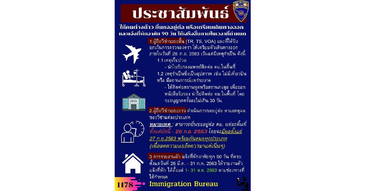 พลตำรวจตรีพรชัย ขันตี รองผู้บัญชาการสำนักงานตรวจคนเข้าเมือง แจ้งประชาสัมพันธ์ให้คนต่างด้าวที่อยู่ในประเทศไทย ยื่นขออยู่ต่อ หรือเตรียมเดินทางออก และแจ้งที่พักอาศัย 90 วัน ให้เสร็จสิ้นภายในเวลาที่กำหนด สำหรับผู้ถือวีซ่าระยะสั้น และได้รับยกเว้นการตรวจลงตรา ให้เตรียมเดินทางออกจากไทย ภายในวันที่ 26 กันยายน 2563 เว้นมีเหตุจำเป็น ได้แก่ กรณีเจ็บป่วย ให้นำใบรับรองแพทย์ติดต่อตรวจคนเข้าเมืองในพื้นที่ แต่หากมีเหตุจำเป็นอื่น เช่น ไม่มีเที่ยวบินกลับไปยังประเทศปลายทาง จากสถานการณ์การแพร่ระบาดของโรคโควิด-19 ขอให้ติดต่อสถานทูต หรือ สถานกงสุล เพื่อออกหนังสือรับรอง ก่อนนำไปติดต่อตรวจคนเข้าเมืองในพื้นที่ โดยจะอนุญาตครั้งละไม่เกิน 30 วัน ส่วนผู้ถือวีซ่าระยะยาว ให้ดำเนินการขออยู่ต่อตามเหตุผลของวีซ่าแต่ละประเภท ตั้งแต่บัดนี้ จนถึงวันที่ 26 กันยายนเช่นกัน โดยขอให้รีบดำเนินการตั้งแต่เนิ่นๆ เพื่อลดความแออัด เช่นเดียวกับการรายงานตัว แจ้งที่พักอาศัยทุก 90 วัน ก็ให้ดำเนินการได้ตามช่องทางที่กำหนด
