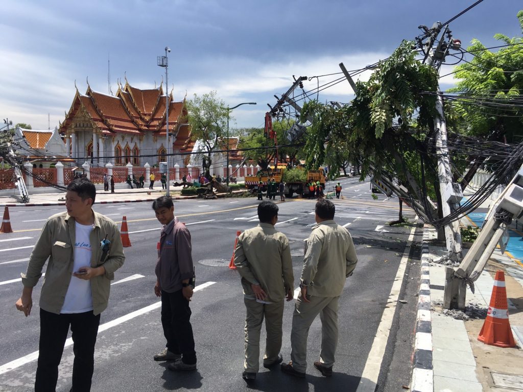 หลังมีลมและฝนตกหนักช่วงเที่ยงที่ผ่านมา ส่งผลให้ต้นมะขามเก่าแก่ริมรั้ววัดเบญจฯหักโค่นพาดเกี่ยวสายไฟฟ้าจนเกิดแรงดึงเสาไฟฟ้าล้มถึง 9 ต้น