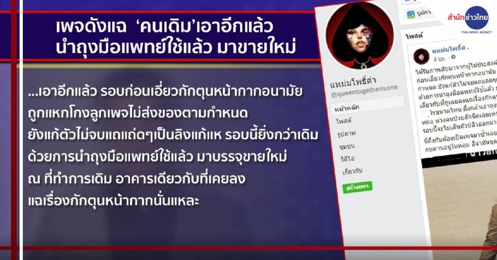 แฟนเพจ แหม่มโพธิ์ดำ โพสต์ข้อความอ้างว่า ได้รับภาพลับมาจากผู้ไม่ประสงค์เอ่ยนามเอาอีกแล้ว รอบก่อนเอี่ยวกักตุนหน้ากากอนามัย รอบนี้ยิ่งกว่าเดิม ด้วยการนำถุงมือแพทย์ใช้แล้ว มาบรรจุขายใหม่ ณ ที่ทำการเดิมที่เคยแฉ เรื่องกักตุนหน้ากากอนามัย ต้อง…ขนาดไหน ถึงกล้าเอาถุงมือแพทย์ใช้แล้วมาขายใหม่ ไม่ห่วงหมอ ห่วงคนป่วยสักนิดเลยเหรอ ติดเชื้อขึ้นมาใครรับผิดชอบ หวังว่ารอบนี้จะไม่เดินตัวปลิวออกมาก่อความผิดต่อหน้าตาเฉยอีกรอบนะ