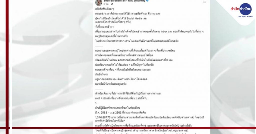 เพจ Sean Buranahiran – ฌอน บูรณะหิรัญ มีความเคลื่อนไหว โดยโพสต์คลิปวิดีโอระบุข้อความว่า ตลอดช่วงเวลาที่ผ่านมา ผมได้ใช้เวลาอยู่กับตัวเอง ทีมงาน และผู้คนในชีวิตจริง โดยที่ไม่ได้ใช้ Social Media เลย และจะยังคงทำต่อไปเรื่อยๆ วันนี้แวะมาขอบคุณกำลังใจที่หลั่งไหลเข้ามาทั้งทางข้อความ และตอนที่ได้เจอกันในที่ต่างๆ รู้สึกอบอุ่นและซึ้งใจมาก ในคลิปจะเป็นบรรยากาศบางส่วนในแต่ละวันที่ผ่านมาที่ไม่เคยเผยแพร่ที่ไหน
