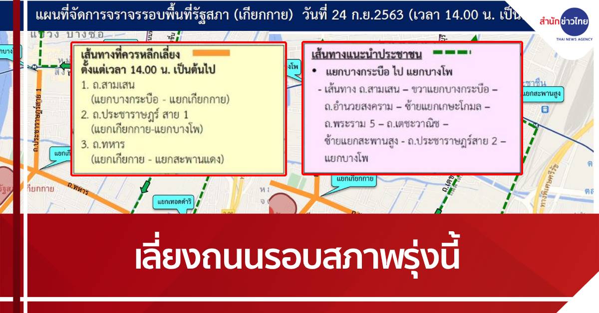 พล.ต.ต.จิรสันต์ แก้วแสงเอก รองผู้บัญชาการตำรวจนครบาล แนะนำประชาชนหลีกเลี่ยงเส้นทางโดยรอบรัฐสภา (เกียกกาย) ที่จะมีกลุ่มประชาชนปลดแอกนัดชุมนุมในวันพรุ่งนี้ (24 ก.ย.) โดยเส้นทางที่อาจได้รับผลกระทบควรหลีกเลี่ยง ได้แก่ ถ.สามเสน (แยกบางกระบอ – แยกเกียกาย) , ถ.ประชาราษฎร์ สาย 1 (แยกเกียกกาย – แยกบางโพ) และ ถ.ทหาร (แยกเกียกกาย – แยกสะพานแดง) ซึ่งจากการประสานข้อมูลทราบว่ากลุ่มผู้ชุมนุมจะเริ่มทยอยเข้าพื้นที่ตั้งแต่เวลา 14.00น. ดังนั้นจึงขอประชาสัมพันธ์ประชาชนที่ไม่มีความจำเป็น ให้หลีกเลี่ยงเส้นทางตั้งแต่ช่วงบ่ายของวันพรุ่งนี้เป็นต้นไป เพื่อลดปัญหาการจราจรติดขัด พร้อมแนะให้ประชาชนไปใช้เส้นทางดังนี้ ถ.สามเสน – ขวาแยกแยกบางกระบือ – ถ.อำนวยสงคราม – ซ้ายแยกโกมล – ถ.พระราม 5 – ถ.เตชะวาณิช – ซ้ายแยกสะพานสูง – ถ.ประชาราษฎร์สาย 2 – แยกบางโพ หรือสามารถโทรสอบถามเพิ่มเติมได้ที่ 1197
