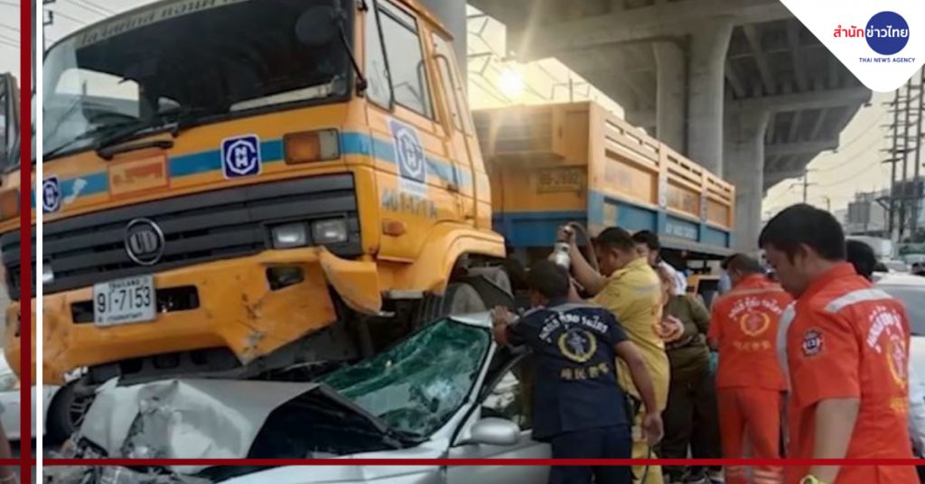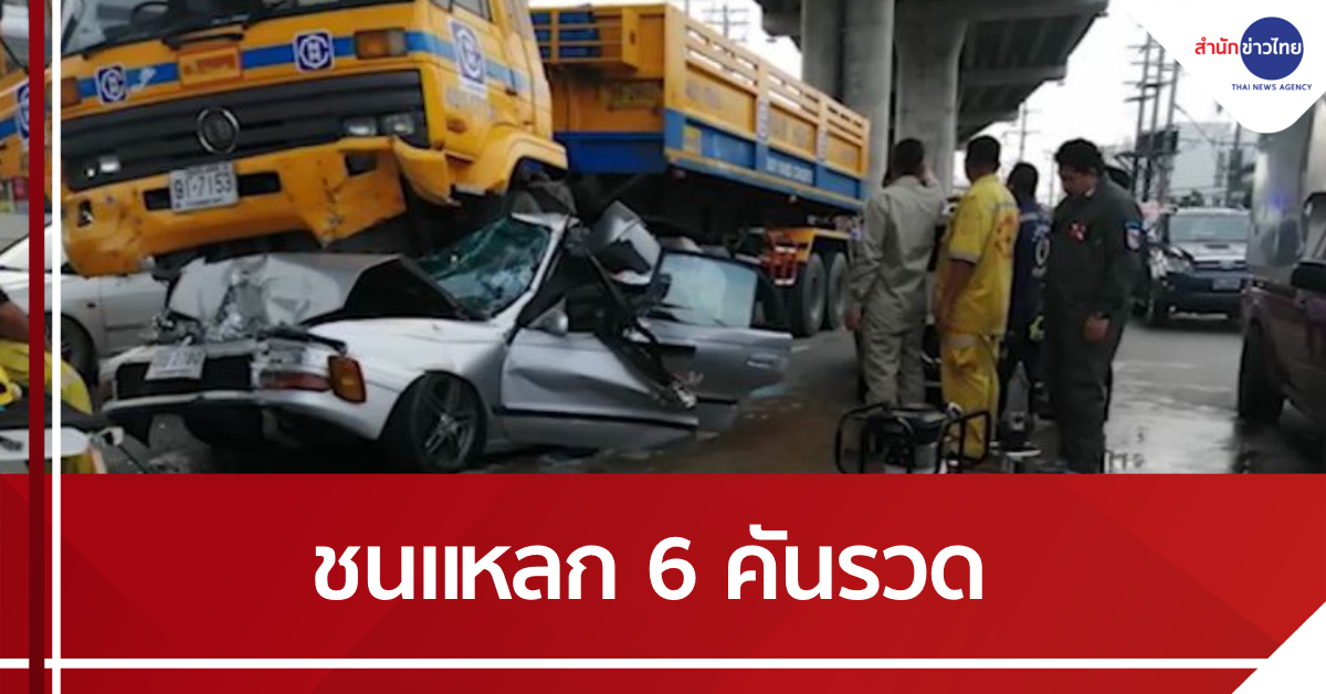 กทม. 23 ก.ย. – รถพ่วง 18 ล้อ เบรกแตก ลมเบรกรถเหลือ 6 เปอร์เซ็นต์ คนขับฝืนขับต่อ ชนแหลก 6 คันรวด ก่อนพุ่งชนรถเก๋งจอดติดไฟแดง บริเวณสามแยกการไฟฟ้ามีนบุรี ถ.สุวินทวงศ์ เขตมีนบุรี เสียชีวิต 1 คน บาดเจ็บ 2 คน