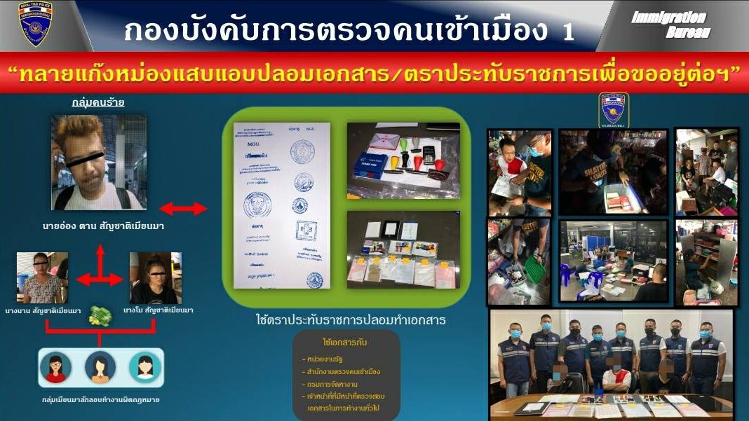 พลตำรวจโทสมพงษ์ ชิงดวง ผู้บัญชาการสำนักงานตรวจคนเข้าเมือง แถลงจับกุมผู้ต้องหาก่อคดีสำคัญ 4 คดี คดีแรก ตำรวจตรวจคนเข้าเมือง 1 จับกุมนายอ่อง ตาน , นางนาน และนางโม ชาวเมียนมา ที่ร้านขายของชำในตลาดลานทรายพลาซ่า ถนนสาธุประดิษฐ์ แขวงบางโพงพาง เขตยานนาวา พร้อมตราประทับปลอมรูปแบบต่างๆ เอกสารราชการปลอม และหนังสือเดินทางเมียนมาอีกจำนวนมาก หลังสืบทราบว่าเป็นแหล่งรับจ้างทำเอกสารราชการปลอม เพื่อใช้ประกอบการขอใบอนุญาตทำงาน และขออยู่ต่อในราชอาณาจักร โดยเปิดร้านขายของชำบังหน้าอยู่ใกล้กับสถานทูตเมียนมา