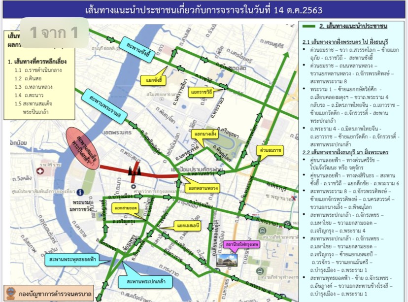 กทม.14 ต.ค.- กองบัญชาการตำรวจนครบาล เปิดเส้นทางที่ได้รับผลกระทบจากการชุมนุมและเส้นทางแนะนำประชาชน