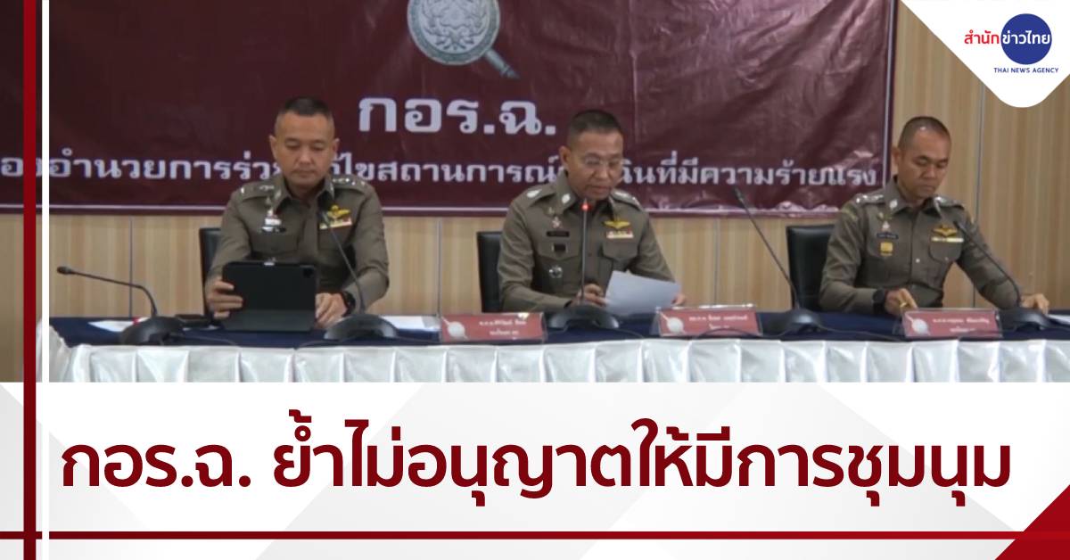 กทม. 18 ต.ค.-กอร.ฉ. ยืนยันไม่อนุญาตให้มีการชุมนุม หากฝ่าฝืนเจ้าหน้าที่จำเป็นต้องบังคับใช้กฎหมาย พร้อมเดินหน้าเอาผิดคนปล่อยข่าวปลอมสร้างความเสียหาย