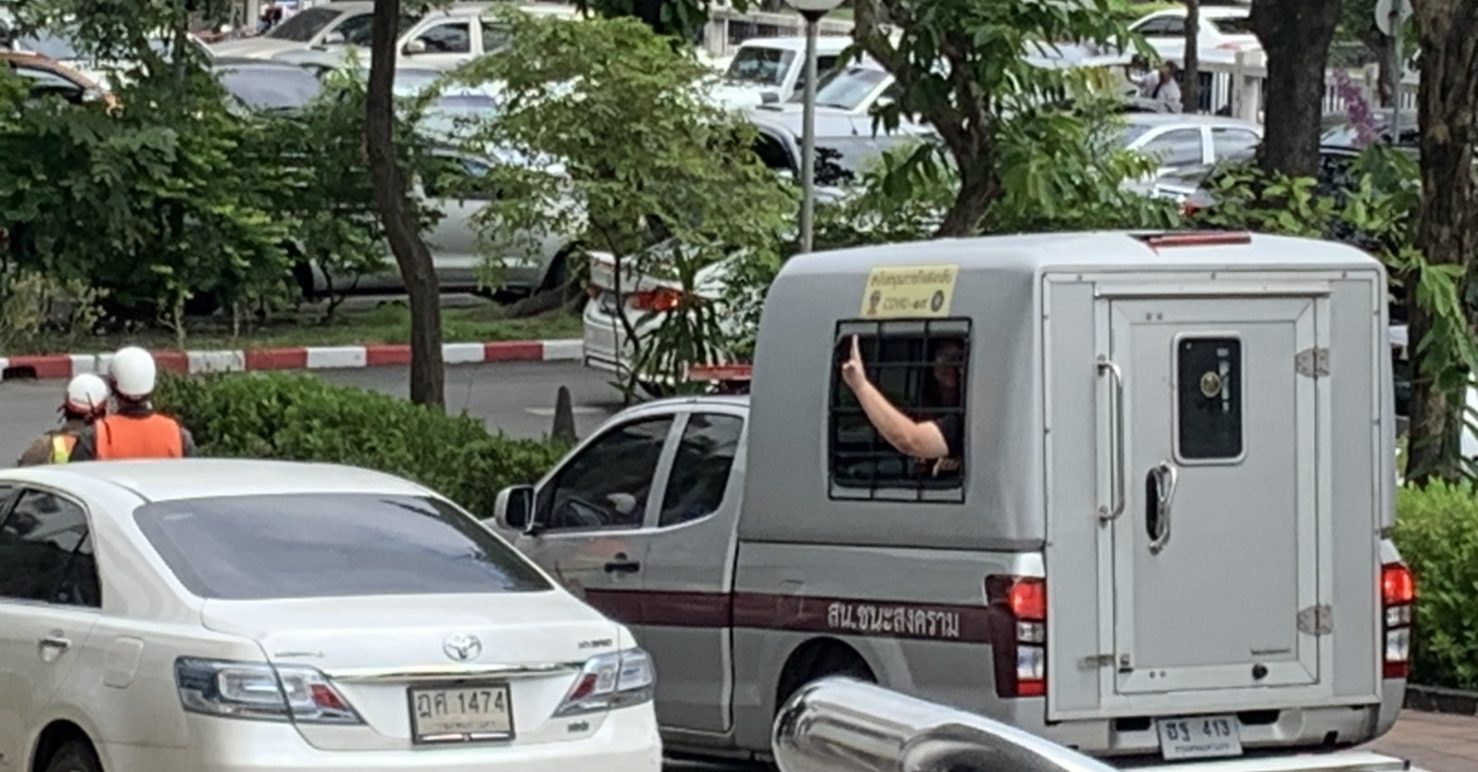 ทั้งคู่ถูกควบคุมตัวด้วยรถควบคุมเข้ามาบริเวณศาลฯ โดยได้เปิดกระจก ชูสามนิ้ว พร้อมตะโกนฝากถึงประชาชนทุกคนว่า “เย็นนี้มารอหนูกลับบ้านกัน”
