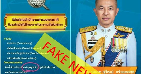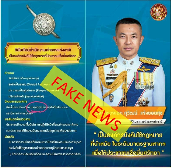 พล.ต.ต.ยิ่งยศ เทพจำนงค์ โฆษกสำนักงานตำรวจแห่งชาติ ชี้แจงกรณีมีการทำภาพลักษณะคล้ายแผ่นพับของสำนักงานตำรวจแห่งชาติ โดยปรากฏชื่อ พล.ต.อ.สุวัฒน์ แจ้งยอดสุข ผบ.ตร. และวิสัยทัศน์สำนักงานตำรวจแห่งชาติ แต่มีข้อความที่ทำให้คลาดเคลื่อนไปนั้น โดยปรากฏว่ามีการทำภาพคล้ายแผ่นพับปรากฏรูปของ พล.ต.อ.สุวัฒน์ และในด้านซ้ายของภาพดังกล่าวมีข้อมูลวิสัยทัศน์สำนักงานตำรวจแห่งชาติ ในหัวข้อวัฒนธรรมองค์กร ระบุว่า “…บำรุงทุกข์บำรุงสุข…” นั้น พล.ต.ต.ยิ่งยศ โฆษก ตร. ได้ชี้แจงว่า กรณีดังกล่าวเป็นการแก้ไขภาพทำให้เข้าใจความหมายและถ้อยคำคลาดเคลื่อน ที่ถูกแล้วจะต้องเป็นคำว่า “…ยึดมั่นในระเบียบวินัย บำบัดทุกข์บำรุงสุขให้กับประชาชน…” ซึ่งกรณีดังกล่าวถือว่าไม่เป็นความจริง (Fake News) ในเบื้องต้นจากการตรวจสอบไม่พบเอกสารต้นฉบับแต่อย่างใด พบแต่เพียงการเผยแพร่ในโซเชียลมีเดียเท่านั้น