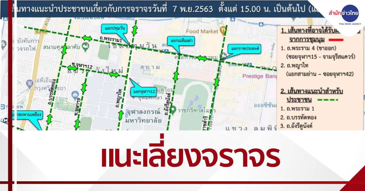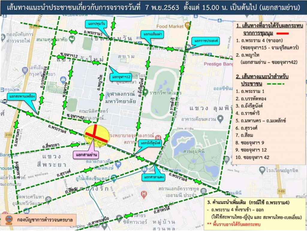 พล.ต.ต.จิรสันต์ แก้วแสงเอก รอง ผบช.น. และ พล.ต.ต.ธีระพงษ์ วงษ์รัฐพิทักษ์ ผบก.จร. ขอประชาสัมพันธ์ข่าวสารให้ประชาชนผู้ใช้รถใช้ถนนได้รับทราบประจำวันที่ 7 พ.ย.2563 ตามที่ปรากฏตามสื่อโซเชียลมีเดีย ได้มีประกาศนัดรวมพลของกลุ่มผู้ชุมนุมบริเวณแยกสามย่านในเวลา 16.00 น. และจะเคลื่อนตัวไปบริเวณถนนสีลม โดยใช้ถนนพระราม 4-ถนนสีลมนั้น
