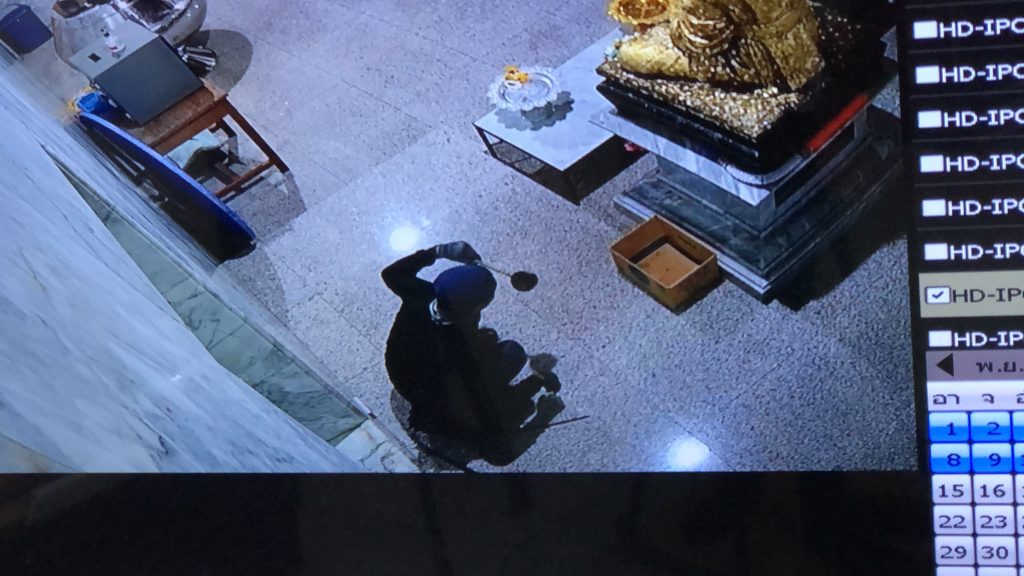 อยู่ในกระเป๋าเป้ ออกมางัดทำลายช่องใส่เงินบริจาคที่ดัดแปลงมาติดตั้งบนฝาตู้เซฟแล้วกวาดเงินใส่ระเป๋าเป้ไปจนหมดตู้ โดยระหว่างที่ก่อเหตุยังดื่มน้ำมนต์จากบาตรสแตนเลสขนาดใหญ่ที่ทางวัดเตรียมไว้ให้ญาติโยมตักกลับบ้านเพื่อความเป็นสิริมงคล