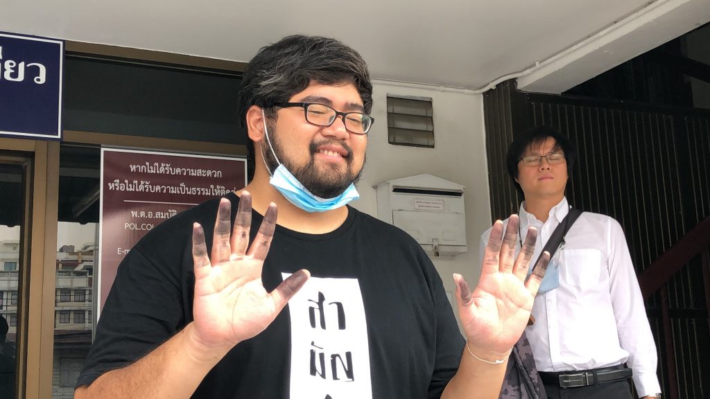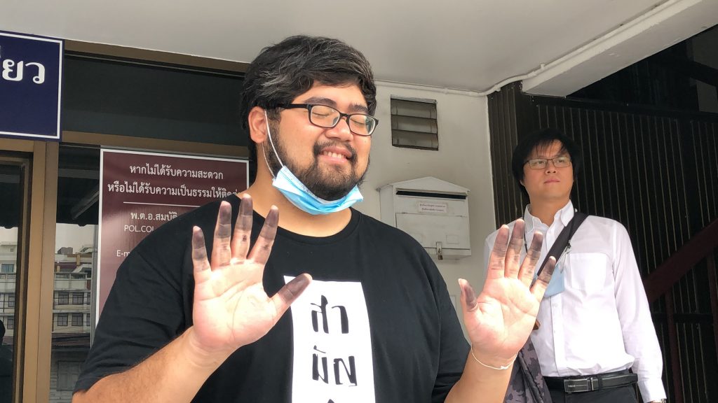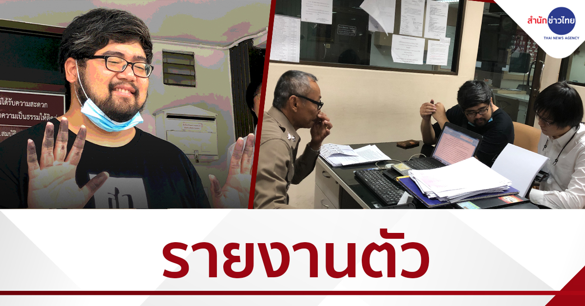 กรุงเทพฯ 20 พ.ย.- นักร้องนำวงสามัญชน รายงานตัวตามหมายเรียกฐานชุมนุมฝ่าฝืน พ.ร.ก.ฉุกเฉิน หน้าเซ็นทรัลฯ ปิ่นเกล้า