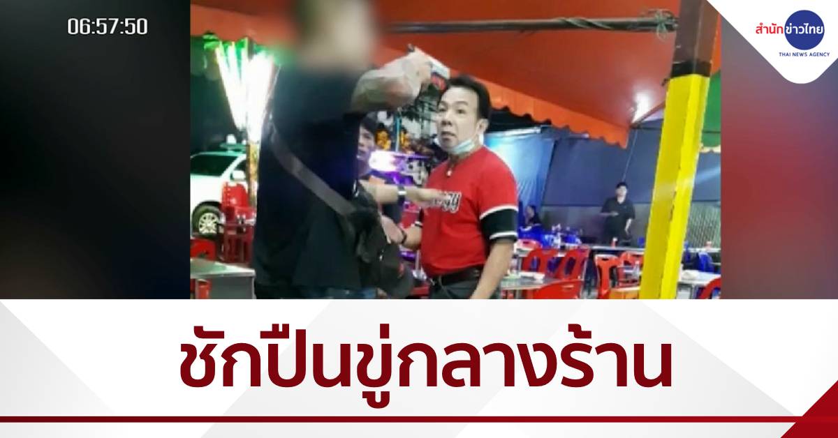 กรุงเทพฯ 7 ธ.ค.-หนุ่มกร่างชักปืนขู่คู่กรณีกลางร้านข้าวต้มย่านประเวศ หลังมีเรื่องชกต่อยกัน หญิงที่มาด้วยเข้าห้ามและพาตัวออกไป