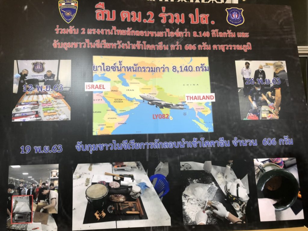 ตำรวจสืบสวนตรวจคนเข้าเมือง 2 ร่วมกับตำรวจปราบปรามยาเสพติด จับกุมนายเต่ง คนพื้นที่สูง ชาวจ.เชียงราย ขณะเตรียมลักลอบนำยาไอซ์ที่ซุกซ่อนบรรจุในซองเกลือแร่ ใส่ในกระเป๋าเดินทางน้ำหนักกว่า 4.1 กิโลกรัม ขณะเดียวกันยังจับกุมนายคาย เเซ่เหลา คนพื้นที่สูงจ.เชียงรายเช่นกัน ขณะเตรียมนำยาไอซ์ ซุกซ่อนในก้อนสบู่ เเละซองชา รวมน้ำหนัก 4.04 กิโลกรัม ใส่ในกระเป๋าเดินทาง ทั้ง2คดี เตรียมที่จะเดินทางออกนอกประเทศไทยไปยังประเทศอิสราเอล ผ่านทางท่าอากาศยานสุวรรณภูมิ