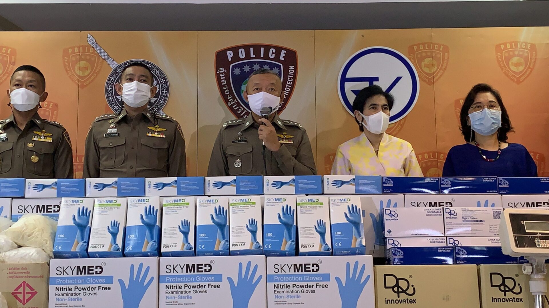 พล.ต.ท.เพิ่มพูน ชิดชอบ ผู้ช่วย ผบ.ตร และตำรวจกองบังคับการตำรวจปราบปรามการกระทำความผิดเกี่ยวกับคุ้มครองผู้บริโภค หรือ ปคบ. ร่วมกับ ภญ.สุภัทรา บุญเสริม รองเลขาธิการคณะกรรมการอาหารและยา หรือ อย. แถลงผลการตรวจยึดถุงมือยาง ยี่ห้อ skymed รวมมูลค่ากว่า 8 ล้านบาท