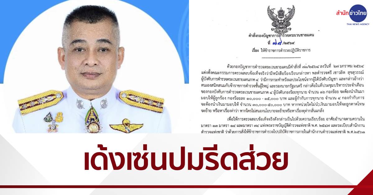 5 ก.พ.-ผู้บัญชาการตำรวจตระเวนชายแดน มีคำสั่งแต่งตั้งคณะกรรมการตรวจสอบข้อเท็จจริงกรณีมีหนังสือร้องเรียนว่า ผบก.ตชด.ภาค4 รับส่วยจากตำรวจชั้นผู้น้อย พร้อมสั่งให้ไปปฏิบัติราชการที่ศูนย์ปฏิบัติการกองบัญชาการตำรวจตระเวนชายแดน โดยขาดจากตำแหน่งเดิม