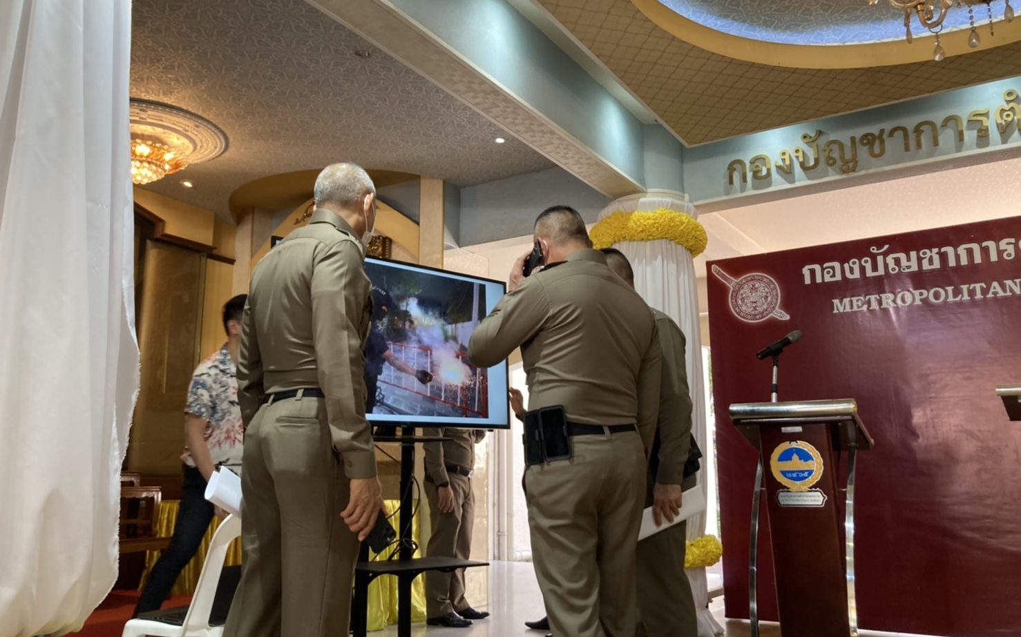 ระหว่างนั้นเกิดเสียงดังและมีความวุ่นวายระหว่างผู้ชุมนุมกับตำรวจขึ้น โดยมีผู้อ้างว่าได้รับผลกระทบจากสารคล้ายแก๊สน้ำตา ขอชี้แจงว่าปกติก่อนใช้แก๊สน้ำตา ตำรวจต้องประกาศแจ้งเตือน และสวมใส่เครื่องป้องกันให้ตัวเองก่อน จึงเป็นไปไม่ได้เลยที่ตำรวจจะเป็นฝ่ายใช้แก๊สน้ำตา และกองร้อยควบคุมฝูงชนก็เพิ่งเดินทางถึง สน.ปทุมวัน ยังไม่มีการจัดกำลังตั้งแถวตามยุทธวิธีแต่อย่างใด ส่วนจะเป็นฝ่ายใดใช้แก๊สน้ำตานั้นต้องมีการตรวจสอบข้อเท็จจริง