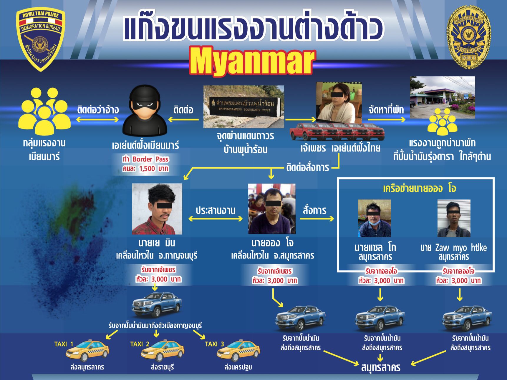 พฤติการณ์ของ “เจ๊เพชร” ทำหน้าที่เป็นเอเย่นต์ฝั่งไทย ประสานกับเอเย่นต์เมียนมา เมื่อมีแรงงานที่ต้องการเข้าประเทศไทย จะต้องเสียค่าดำเนินการตั้งแต่ 6,000-12,000 บาท และเอเย่นต์ในเมียนมาจะออกเอกสารผ่านแดนให้แรงงาน หรือ Border pass และเข้ามาทางจุดผ่านแดนถาวรบ้านพุน้ำร้อน จ.กาญจนบุรี หรือหากไม่มีเอกสารผ่านแดน ก็ลักลอบเข้ามาทางชายแดนธรรมชาติ จากนั้น “เจ๊เพชร” จะทำหน้าที่จัดหาที่ทำงานและที่พักให้แรงงาน พร้อมสั่งให้นายเยมิน และกลุ่มนายอองโจ เป็นผู้ขับรถพาแรงงานไปยังที่พักใน จ.กาญจนบุรี และสมุทรสาคร ตามพื้นที่รับผิดชอบ
