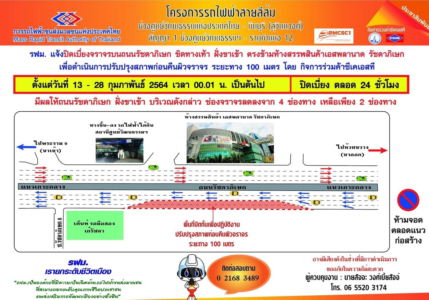 เนื่องจาก รฟม. ได้ดำเนินการการก่อสร้างโครงการรถไฟฟ้าสายสีส้ม ซึ่งมีความจำเป็นต้องปิดเบี่ยงการจราจรบนถนนรัชดาภิเษก ฝั่งขาเข้า ตรงข้ามห้างสรรพสินค้าเอสพลานาด รัชดาภิเษก ส่งผลให้ช่องทางการจราจรลดลงจาก 4 ช่องทาง เหลือเพียง 2 ช่องทาง เป็นระยะทางประมาณ 100 เมตร ระหว่างวันที่ 13-28 ก.พ.64 ตลอด 24 ชั่วมง ทำให้บริเวณดังกล่าวมีลักษณะเป็นคอขวด ประกอบกับโรงเรียนในสังกัด กทม. เปิดเรียนทุกโรงเรียน ส่งผลให้สภาพการจราจรมีปริมาณรถหนาแน่น โดยเฉพาะในช่วงเวลาเร่งด่วนเช้า-เย็น ดังนั้น บช.น. จึงขอประชาสัมพันธ์แนะนำประชาชนผู้ใช้รถใช้ถนน หากไม่มีความจำเป็น โปรดหลีกเลี่ยงเส้นทางดังกล่าวเพื่อความสะดวกในการเดินทาง