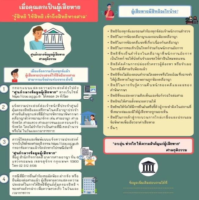 สำหรับ “ศูนย์กลางข้อมูลผู้เสียหาย” ให้เป็นศูนย์กลางรวบรวมข้อมูลและความประสงค์ในการใช้สิทธิทางศาลของผู้เสียหาย ซึ่งสามารถแจ้งสิทธิได้โดยสะดวกตั้งแต่แจ้งความดำเนินคดีโดยไม่ต้องรอให้มีคดีมาถึงศาลก่อน ทั้งนี้ ผู้เสียหายสามารถให้ข้อมูลตามแบบแสดงความประสงค์ได้ตาม 4 ช่องทาง ดังนี้ 1. กรอกแบบแสดงความประสงค์ส่งไปยัง “ศูนย์กลางข้อมูลผู้เสียหาย” ทางเว็บไซต์ https://cios.coj.go.th ได้ตลอด 24 ชั่วโมง 2. แจ้งความประสงค์ต่อเจ้าหน้าที่ประจำศูนย์คุ้มครองสิทธิและเสรีภาพในคดีอาญาประจำศาลชั้นต้นทุกแห่งที่มีอำนาจพิจารณาพิพากษาคดีอาญาทั่วราชอาณาจักร เช่น ศาลอาญา ศาลจังหวัด ศาลแขวง ศาลเยาวชนและครอบครัวจังหวัด โดยไม่จำกัดว่าเป็นศาลที่มีเขตอำนาจหรือไม่ ในวันและเวลาราชการ 3. ดาวน์โหลดและพิมพ์แบบแจ้งความประสงค์จากเว็บไซต์ของศาลยุติธรรมhttps://cios.coj.go.th กรอกข้อความแล้วจัดส่งทางไปรษณีย์มาที่ “ศูนย์กลางข้อมูลผู้เสียหาย” ที่อยู่ สำนักกิจการคดี อาคารศาลอาญา ชั้น 6 แขวงจอมพล เขตจตุจักร กรุงเทพฯ 10900 โทร 02 512 8138 และ 4. กรณีที่มีการยื่นคำร้องขอผัดฟ้อง ฝากขัง หรือยื่นฟ้องต่อศาลแล้ว ผู้เสียหายสามารถแสดงความประสงค์ในการใช้สิทธิที่ศูนย์คุ้มครองสิทธิ ฯ ของศาลดังกล่าว เพื่อความรวดเร็ว ในวันและเวลาราชการเริ่มตั้งแต่วันที่ 18 กุมภาพันธ์ 2564 เป็นต้นไป.-สำนักข่าวไทย