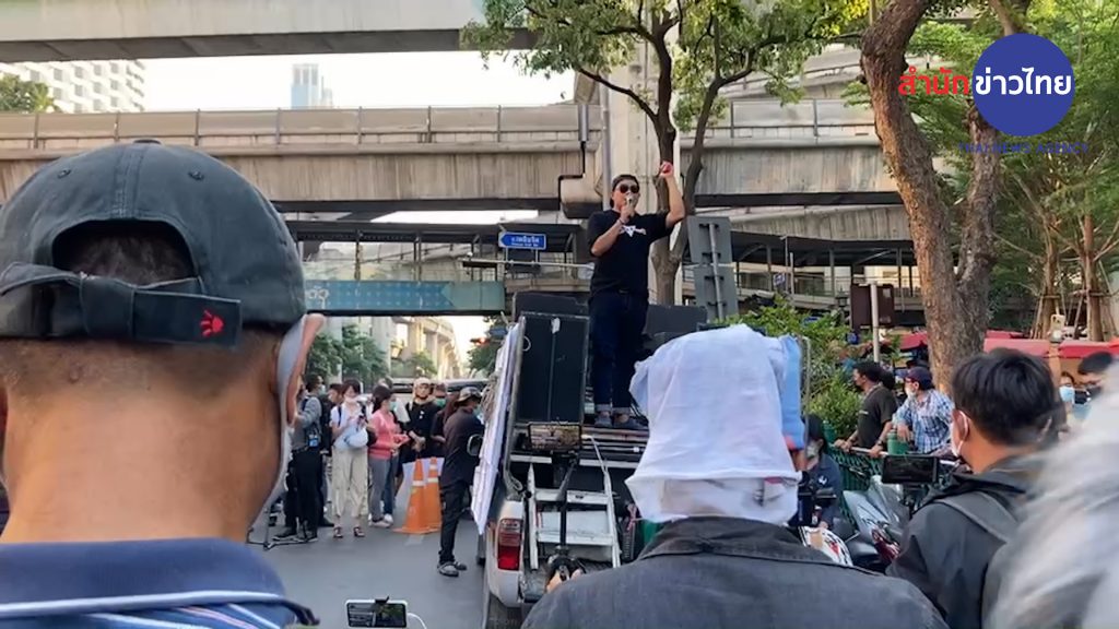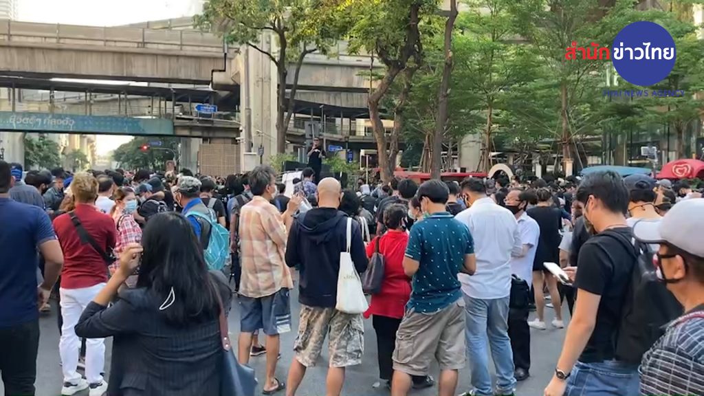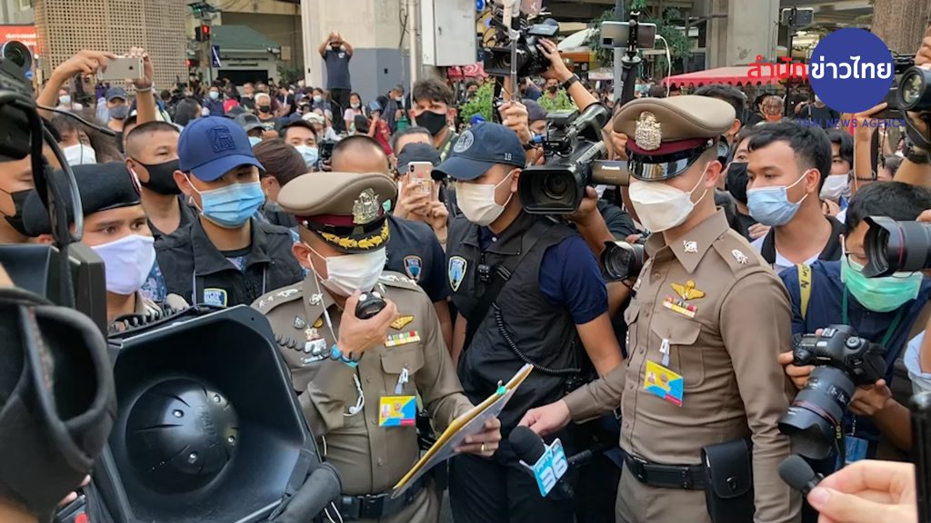 ด้านพันตำรวจเอกจักรกริศน์ โฉสูงเนิน ผู้กำกับ สน.ลุมพินี ได้เดินทางมาประกาศว่าการชุมนุมเป็นการฝ่าฝืนประกาศข้อกำหนดห้ามการจัดกิจกรรม ชุมนุม ตาม พ.ร.ก.ฉุกเฉิน หลังจากนำผู้ชุมนุมเคารพเพลงชาติพร้อมชูสัญลักษณ์ 3 นิ้ว แล้วแกนนำได้นำขบวนผู้ชุมนุมไปยังสำนักงานตำรวจแห่งชาติ ที่มีกำลังตำรวจกองร้อยควบคุมฝูงชนรักษาพื้นที่อยู่ด้านหน้า โดยมีการมอบกล้วยน้ำว้าให้ตำรวจเป็นสัญลักษณ์ของมิตรภาพ ก่อนจะเริ่มปราศรัยถึงปัญหาความไม่เป็นธรรมที่ตำรวจได้รับ เช่น การยุบแท่งบริหารงานบุคคลพนักงานสอบสวน การไม่ได้รับเบี้ยเลี้ยงค่าตอบแทนตามจริง การต้องใช้เงินส่วนตัวซื้อวัสดุอุปกรณ์เอง และการแต่งตั้งโยกย้ายที่ไม่เป็นไปตามหลักความสามารถและอาวุโส .-สำนักข่าวไทย