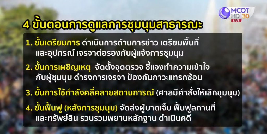 4.ขั้นฟื้นฟู (หลังการชุมนุม) เช่น จัดส่งผู้บาดเจ็บ ช่วยเหลือผู้ได้รับผลกระทบ ฟื้นฟูสถานที่และทรัพย์สิน รวบรวมพยานหลักฐาน และดำเนินคดี