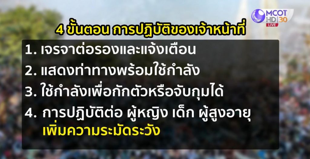 5.การใช้แก๊สน้ำตา จะระมัดระวังหลีกเลี่ยงการขว้างไปโดนตัวบุคคล และระวังอันตรายที่จะเกิดขึ้นกับกลุ่มคนที่อยู่ใกล้เคียง ซึ่งไม่มีส่วนเกี่ยวข้องกับการชุมนุม.-สำนักข่าวไทย