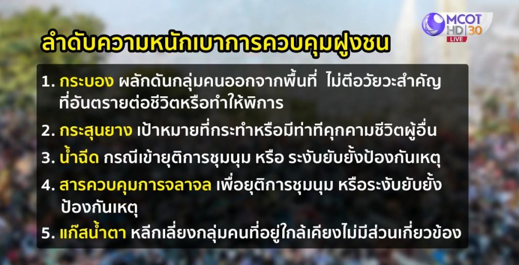สำหรับเครื่องมือ-อุปกรณ์ควบคุมฝูงชน จะใช้ตามความจำเป็น ได้สัดส่วนและเหมาะสมกับสถานการณ์ โดยจะแจ้งเตือนก่อน และมีลำดับความหนักเบาแตกต่างกันไป